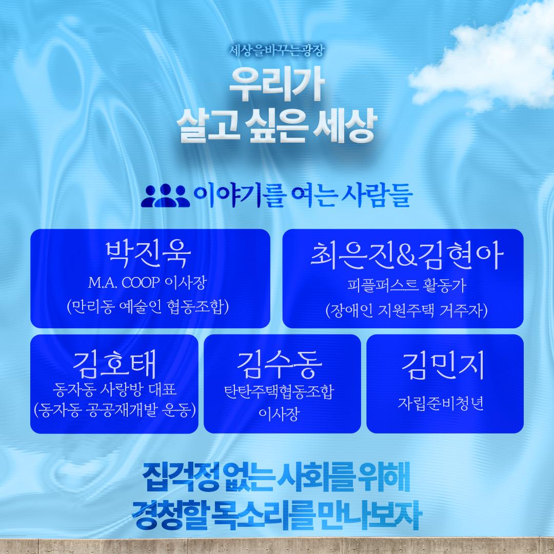 우리 조합을 비롯해 세밧사 등이 공동으로 진행 중인 ‘세상을 바꾸는 광장’의 세번째 만남은 ‘주거권’을 주제로 다양한 목소리를 듣습니다.